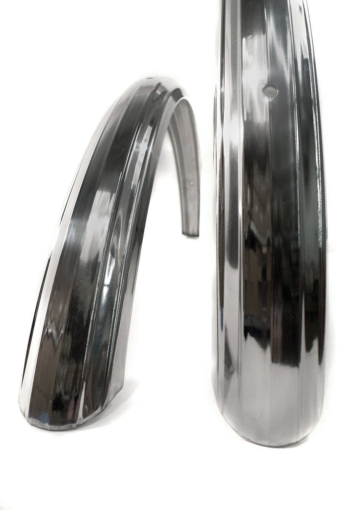 These are a version of the classic zeppelin profile aluminum fenders. They have an elegant art-deco profile that's lovely on classic or modern frames. The 650b size fits 650b wheels perfectly, and is pretty good fit on 26" wheels too.