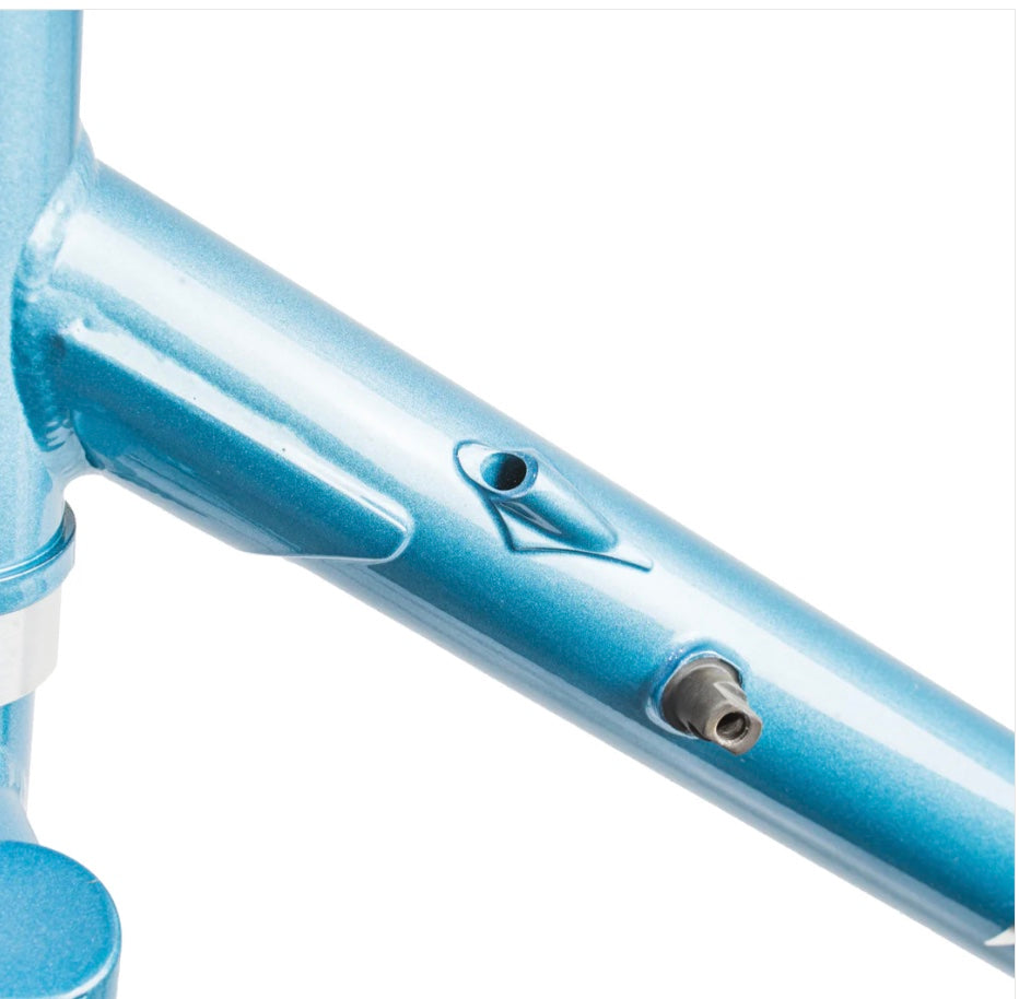 - Fork Eyelets: Double eyelets on fork dropouts for racks and fenders. Triple thru-bosses on the blades for lowrider racks. Hourglass braze-on for Randonneur or Campeur Racks.