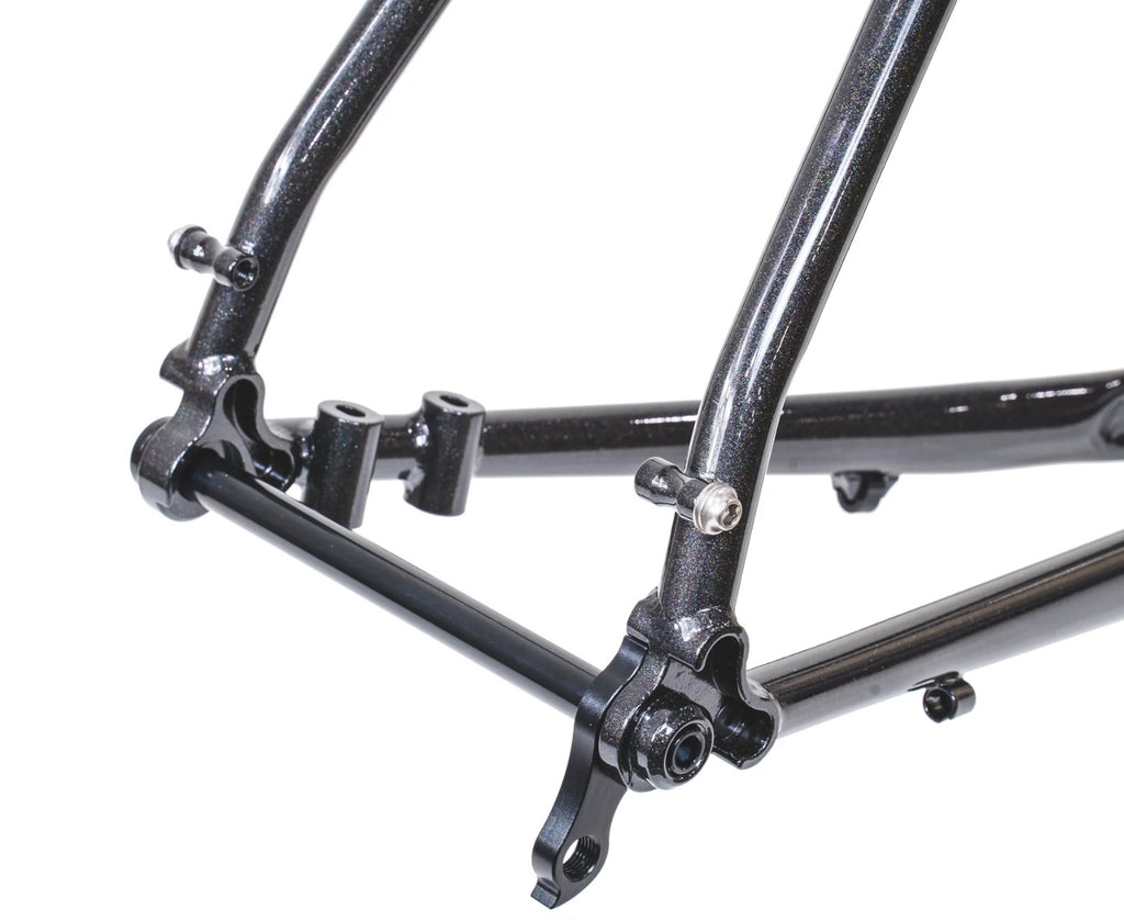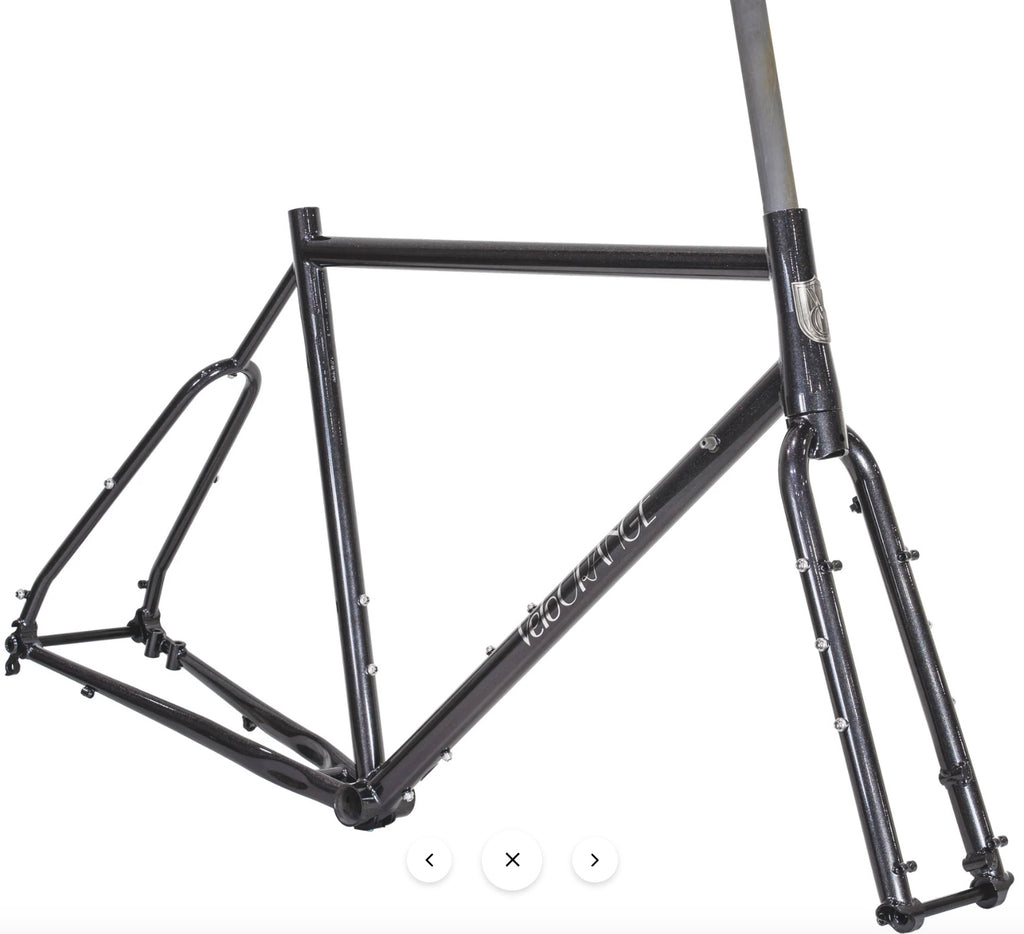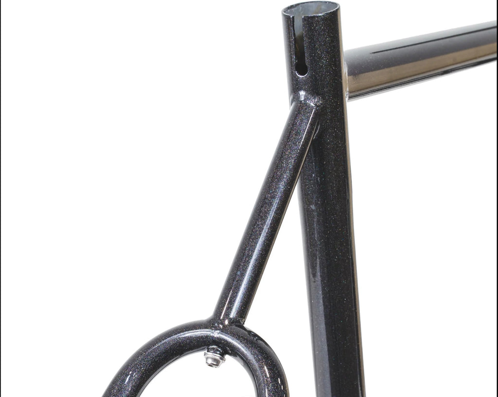 - Fork Eyelets: Double eyelets on fork dropouts for racks and fenders, triple thru-bosses on the blades for cargo cages, hourglass braze-on for Randonneur Rack.