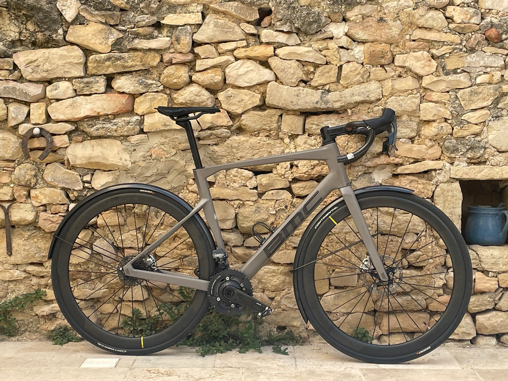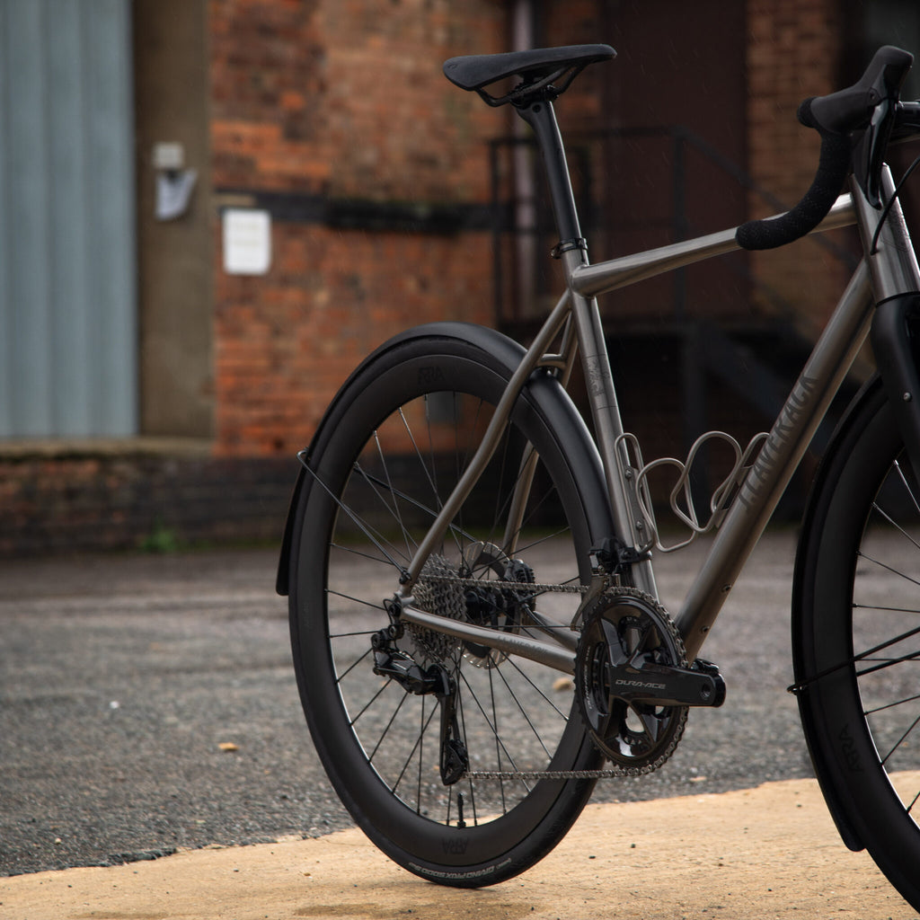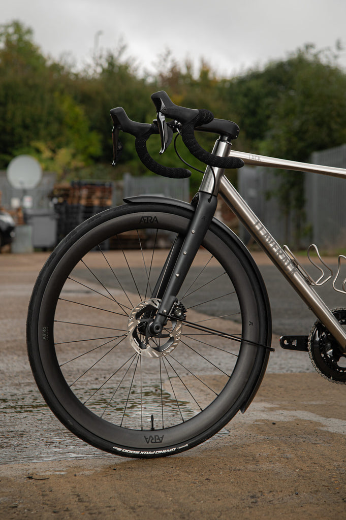 Only 350 grammes for the pair (35mm) - Including all fittings to mount to any road frame that has dedicated threaded mounts. They wrap around the tyres so that there is no aerodynamic drag to speak of. We normally supply them with black stays and fittings, but if you prefer silver, let us know at time of placing your order.